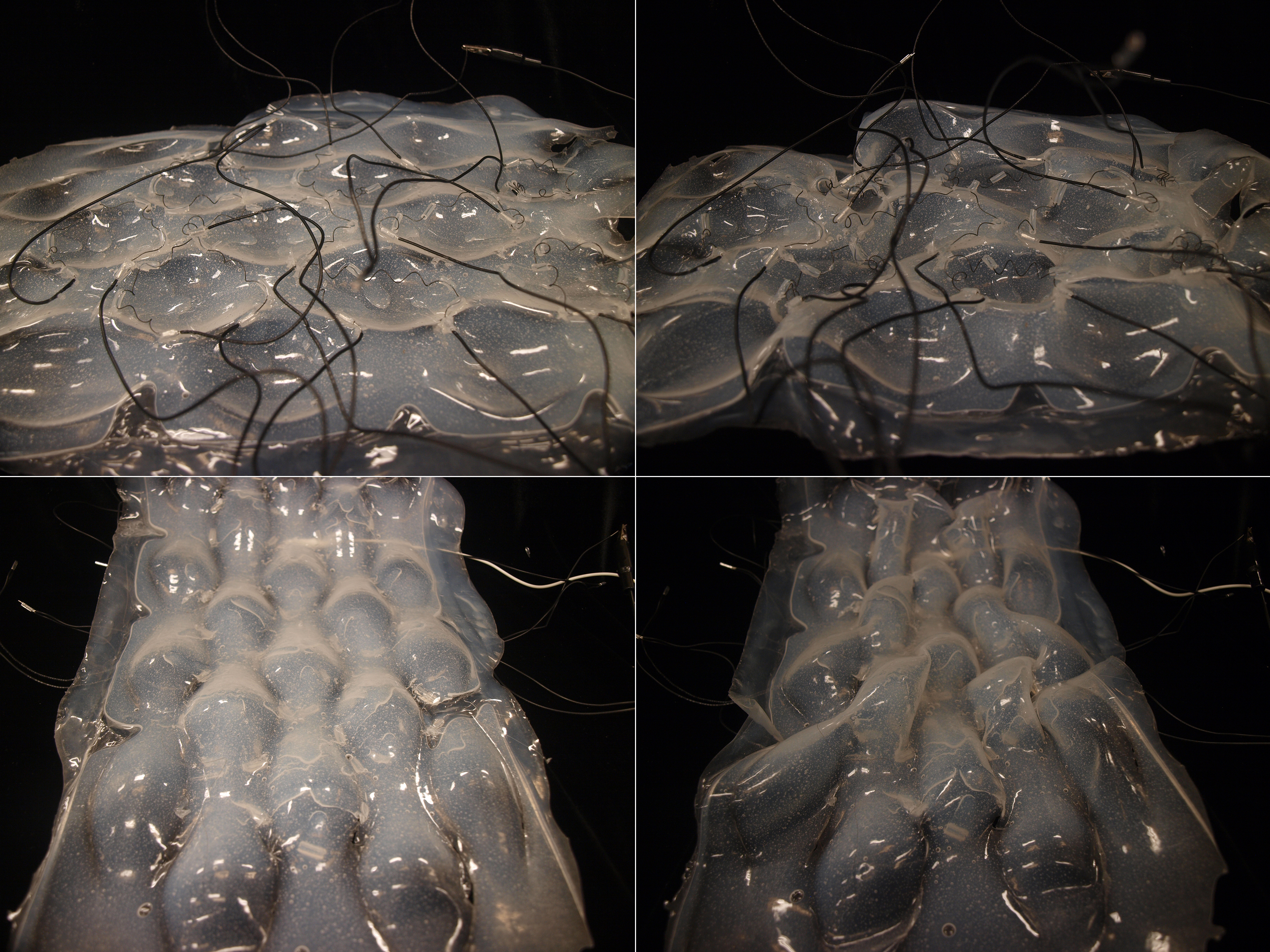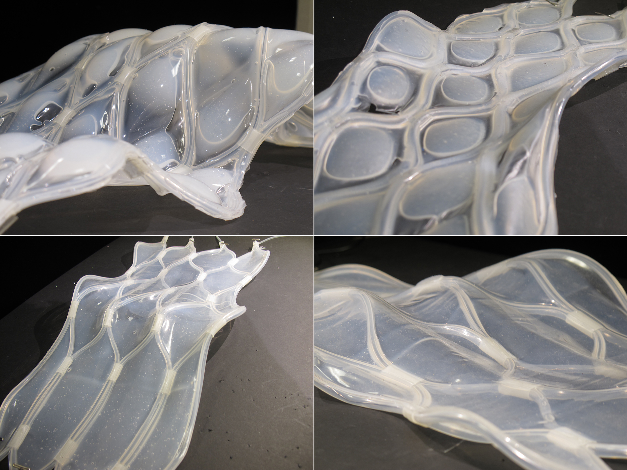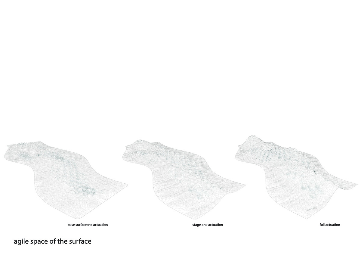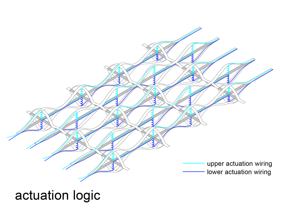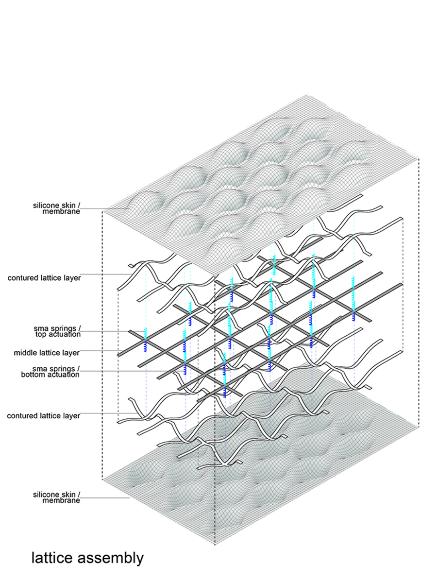 The backbone of this project is a kinetic material system actuated by shape memory alloy (SMA) springs. The material system is developed both as a physical and digital prototype. Its behavior is examined at a physical level and the findings are used to digitally simulate behavior of the larger system. The system utilizes a lattice structure and its structural behavior. It relies on elastic deformation of the constituent members, which allows the forces of bending to be distributed along a wider region of the surface. The system becomes kinetic when the SMA spring actuators are activated. Activation of the springs introduces tension into the lattice members that causes change in the geometry of the lattice cells. The result of this is bending of the wider region of the surface. The lattice can be actuated in the lower or upper zone. Depending on the zone of actuation the lattice deforms and moves upwards or downwards. The contraction of the SMA spring produces a tension in the middle layer of the lattice, which manifests through the deformation of the cell structure, bending an entire region of the lattice. Strategic placement of the actuators across the lattice produces accumulated bending effect and deforms the entire surface.