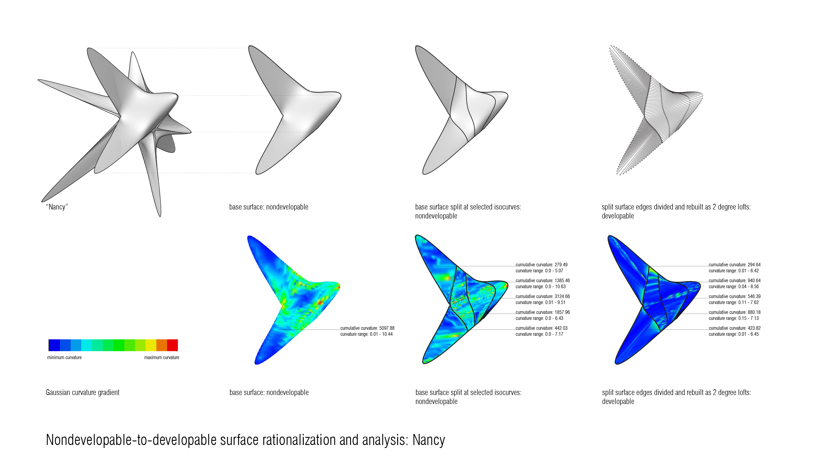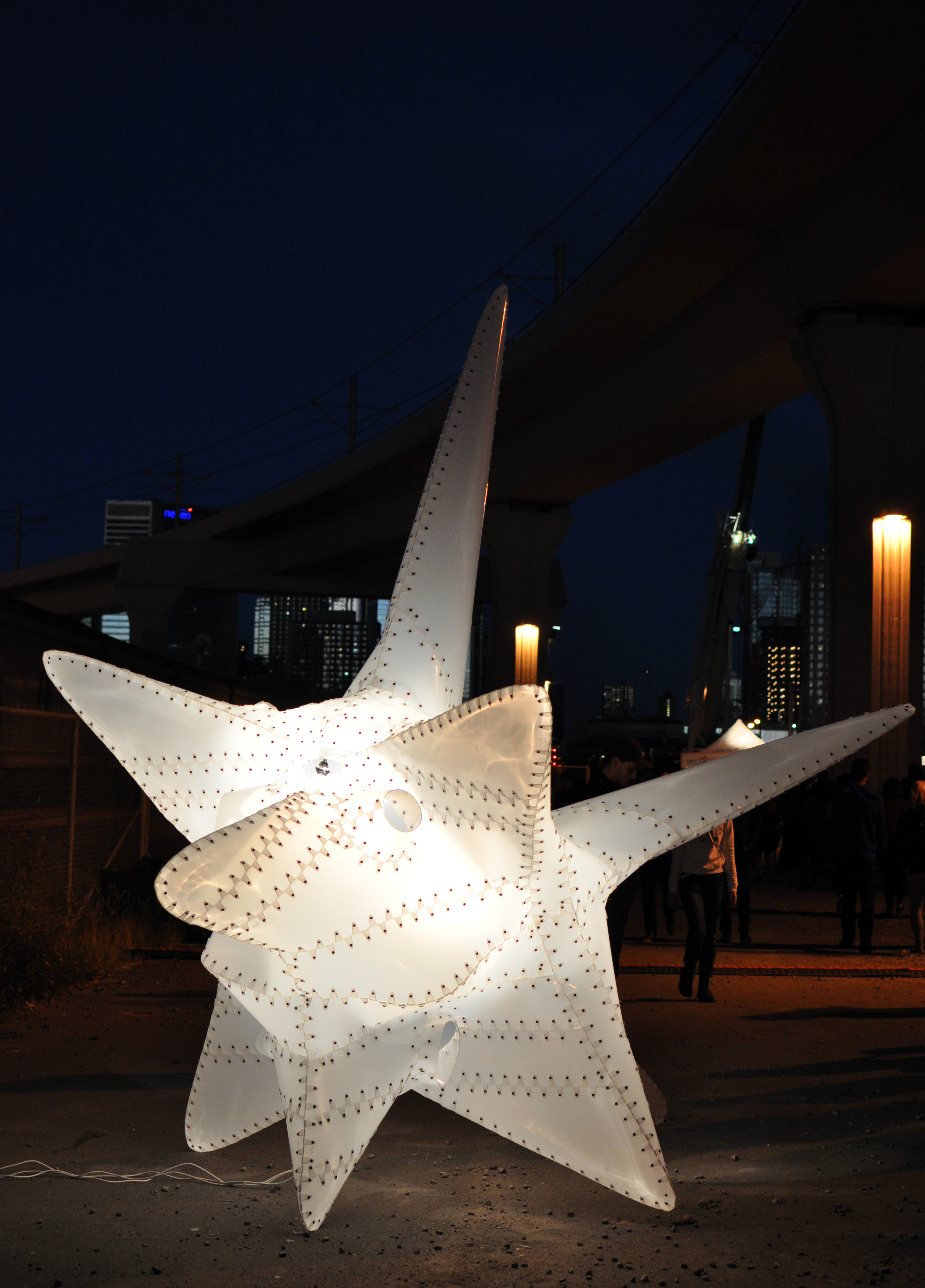 Project Description: Part of an installation at Beakerhead 2015 called The Ministers, Nancy is an investigation of a self-supporting thin shell structure lit from within. The piece anchored the Beakernight event as an object to draw visitors into the space from the main street. This project was designed in collaboration with Mariana Ibanez and Simon Kim of IK Studio. The design focused on using various types of flat stock plastics to explore the limits of double curvature.