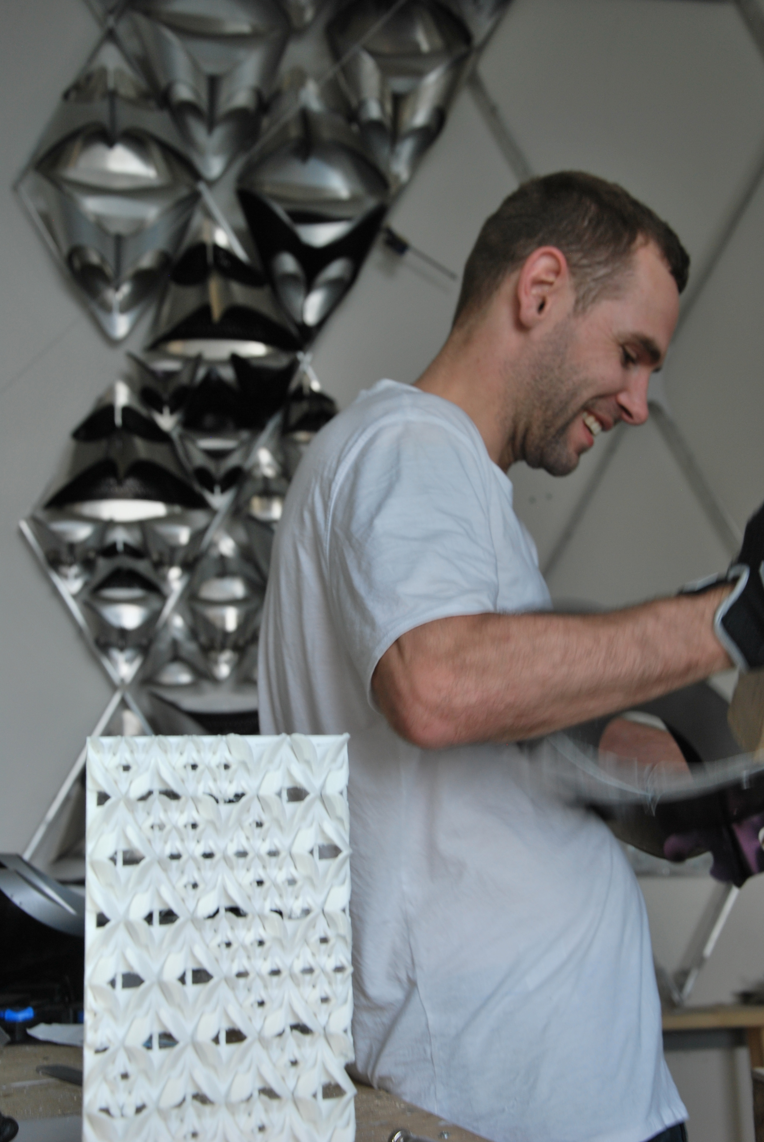 The work is composed of hundreds of custom milled, rolled and anodized aluminum components mounted to an exterior wall facing a public plaza. The components, flatcut using a CNC router and formed by hand, are of different sizes and occupy a diagrid with varying levels of subdivision. The components are anodized in black or clear, or are left in a raw state. The colouration and subdivision are driven by a parametric definition which uses multiple layers of image mapping to create a complex visual effect, which is amplified by the curving forms and variety of sizes, colours, and finishes. The combination of these elements plays with the viewer’s pattern recognition system to activate a sense of pareidolia, a response where we project our own meanings or interpretations onto complex formations, which is exemplified by the act of seeing faces in clouds.