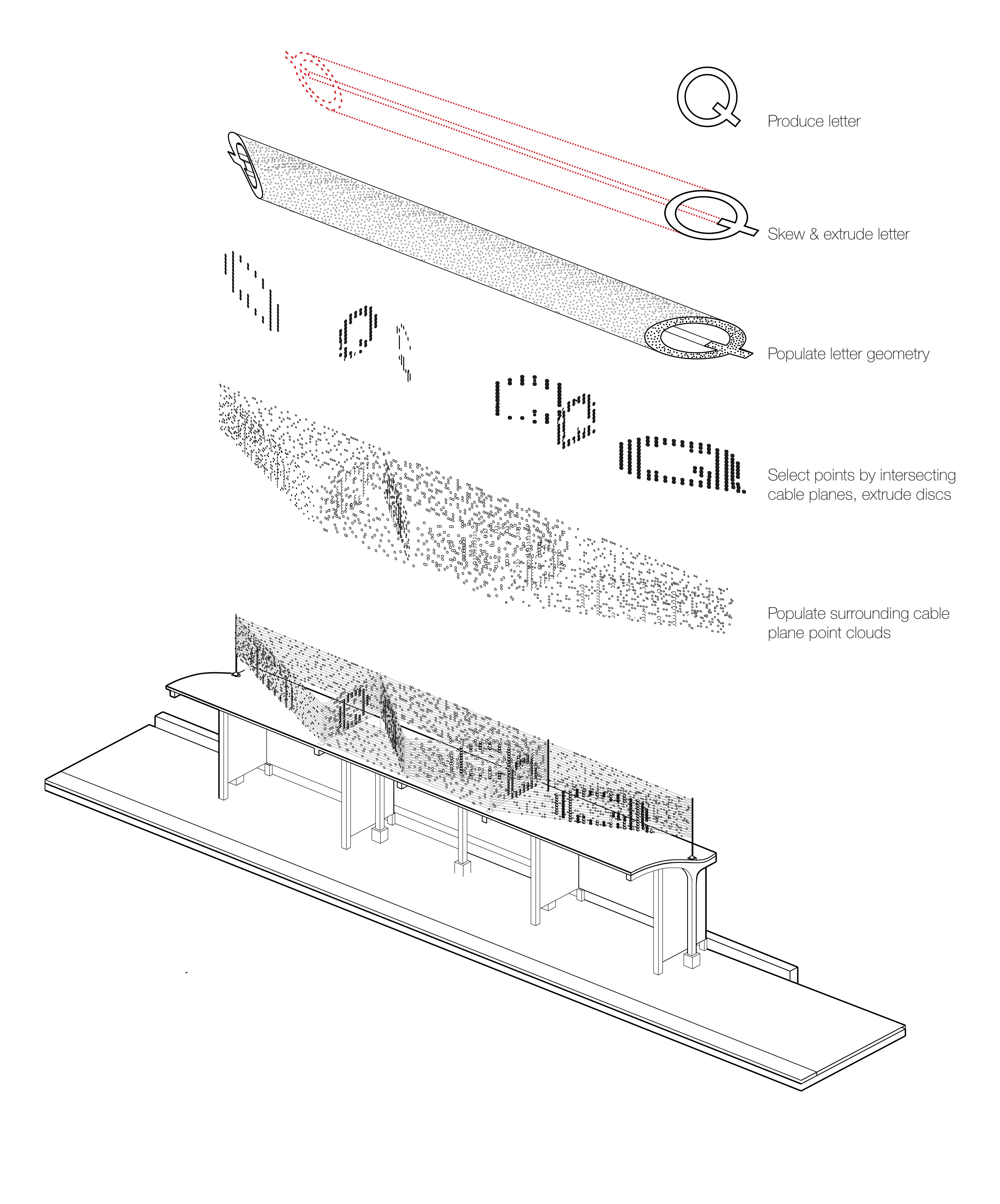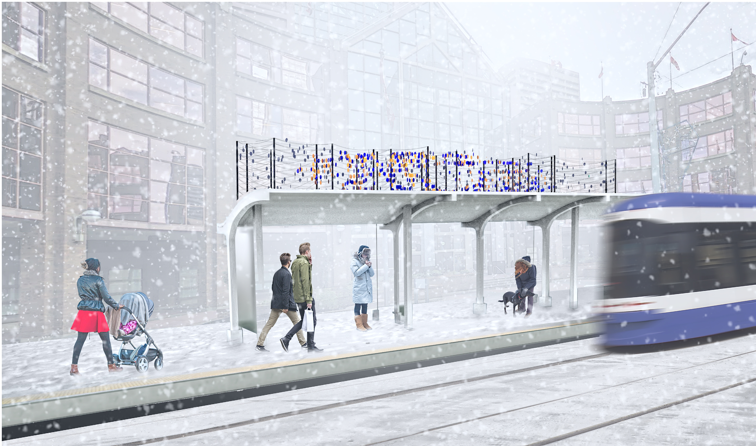 The project is composed of a field of brightly coloured discs attached to a grid of thin wires in such a way as to allow the discs to flutter in the wind, reflect light and produce patterns on the spaces around them. The technique is such that we can experiment with various iterations of pattern and symbols in the consultation, design, and fabrication process. FloQ captures the ways in which we move and evolve cities and cultures in response to the one another and the conditions that surround us.