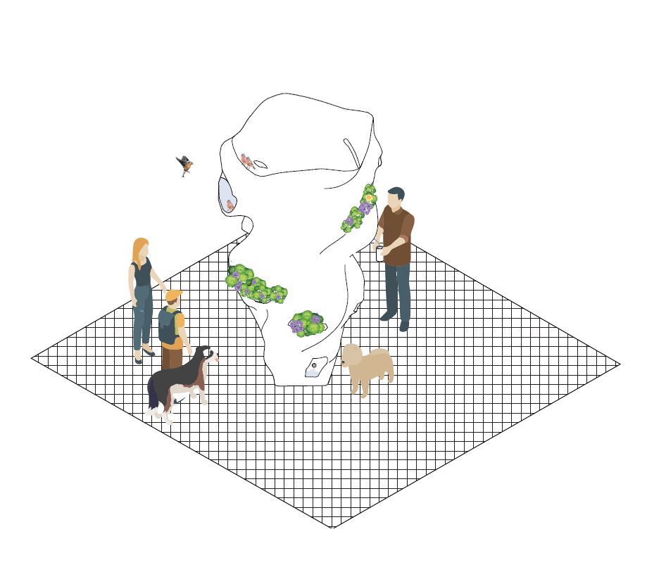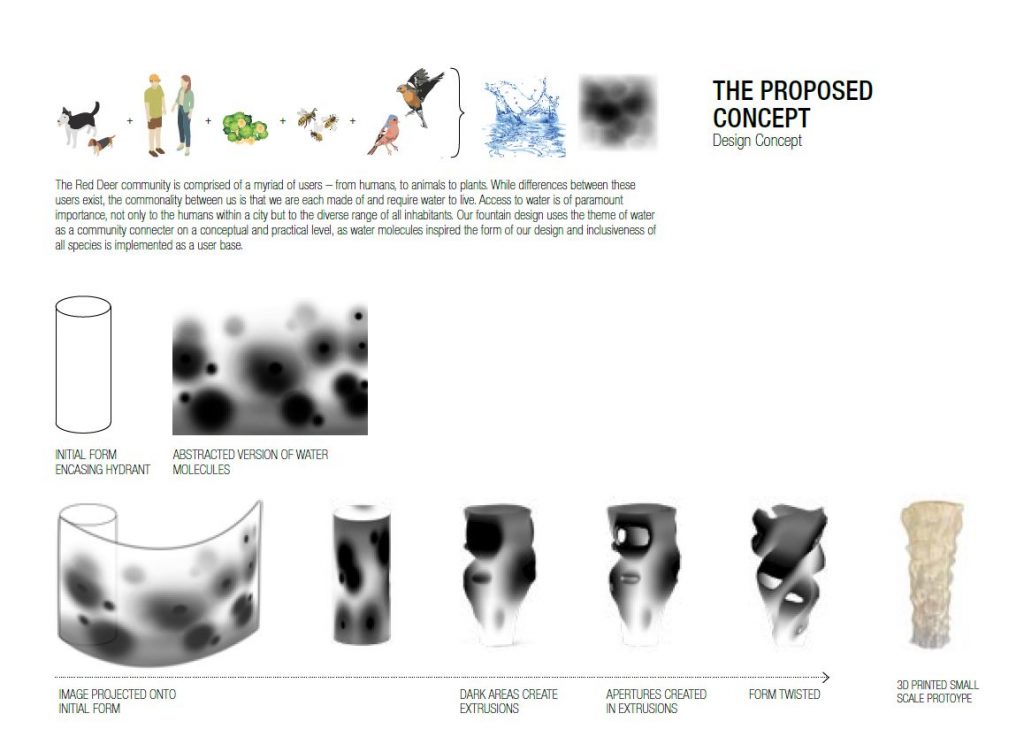 The aim of the Red Deer Public Water Project was to act as an innovative appendage and drinking fountain for the public that also highlighted the importance of providing access to drinkable water for all. This project took the idea of an all-inclusive water fountain and ran with it – designing a fountain inclusive of humans, animals, and plants. The fountain design used the theme of water as a community connector on a conceptual and practical level, with a parametric form driven by an image of water molecules. The large- scale 3d printed fountain shell would attach to an existing fire hydrant and would provide height relevant basins from which humans, birds, and dogs could drink. The installation would also form insets for potted plants that would be misted by the hydrant water. A truly all-inclusive drinking solution.